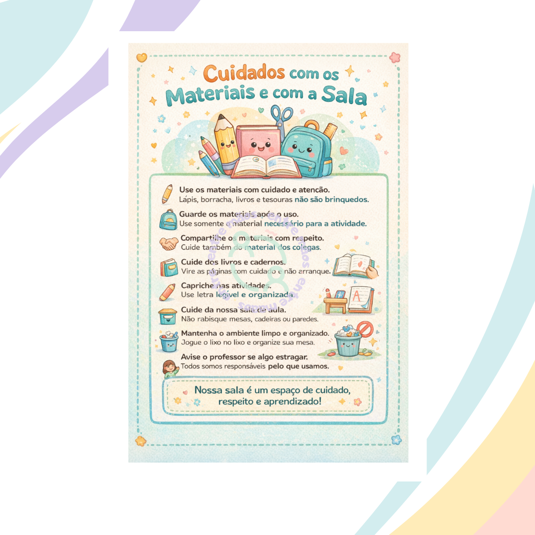 Este cartaz auxilia o professor a trabalhar, de forma visual e afetiva, os combinados da turma, incentivando o cuidado com os materiais escolares e com o espaço da sala de aula. Com linguagem acessível e ilustrações acolhedoras, ele favorece o diálogo, a organização e o senso de pertencimento dos alunos.