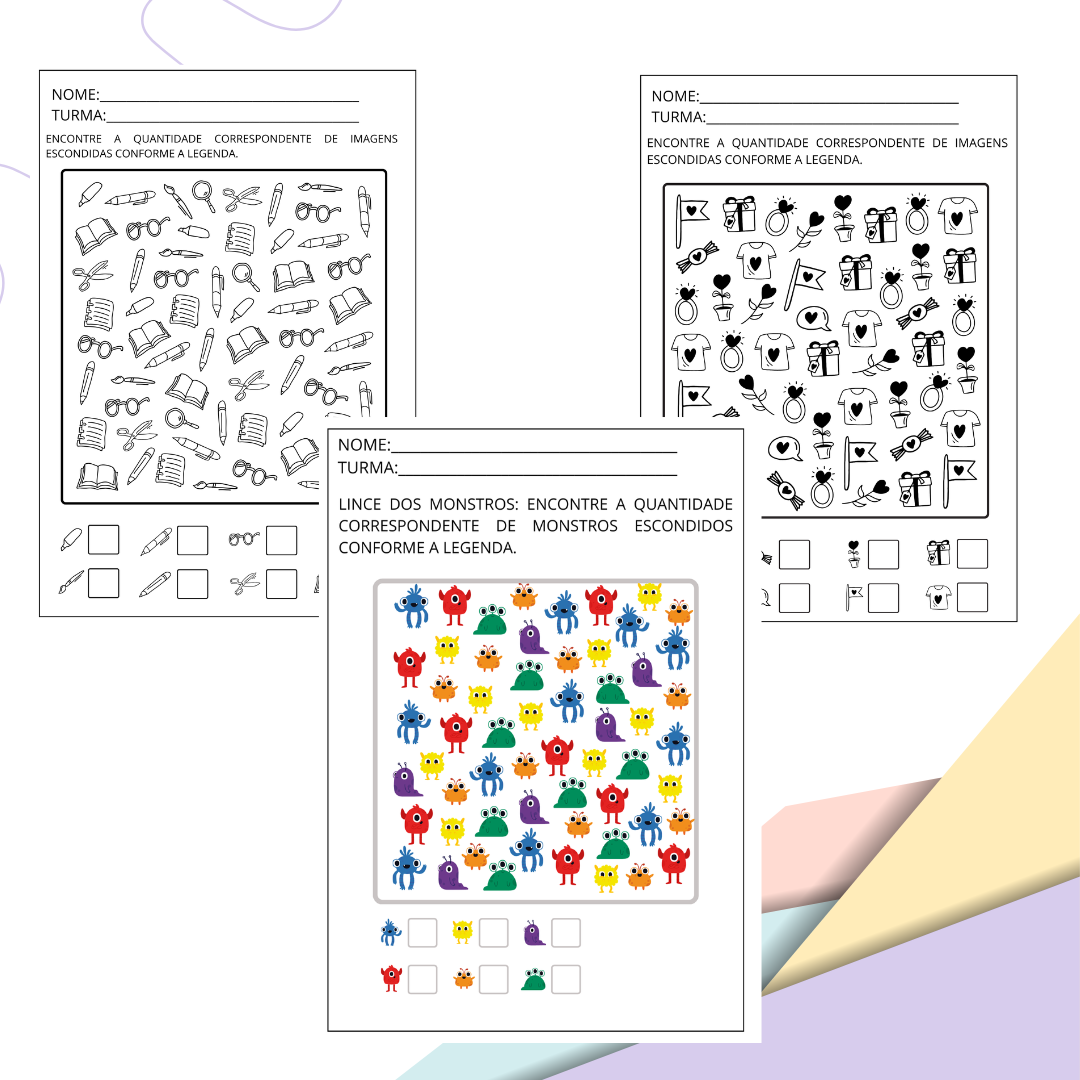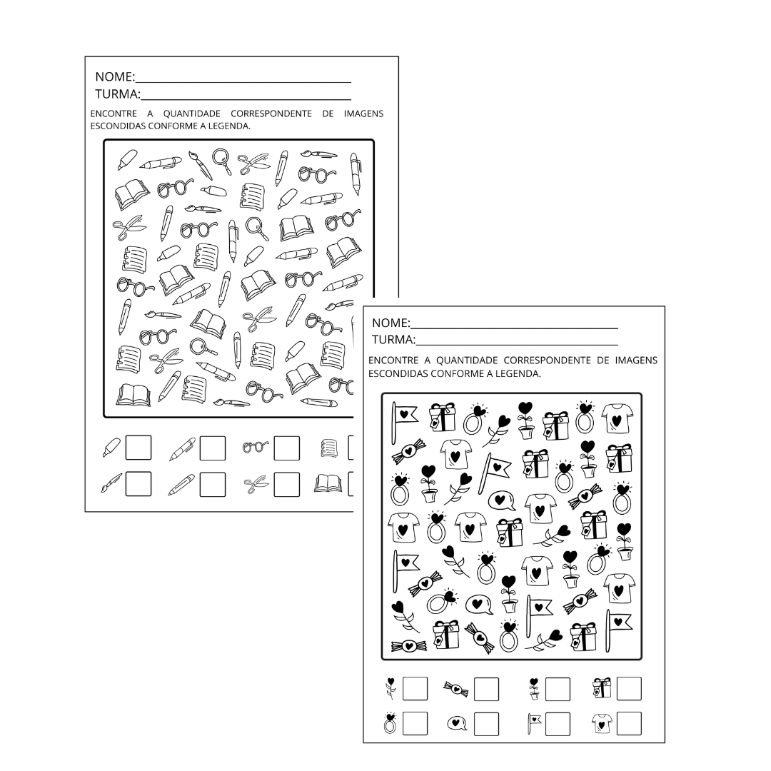 O objetivo é encontrar as imagens indicadas na legenda, observando com atenção e descobrindo rapidamente a quantidade exata de cada uma delas.